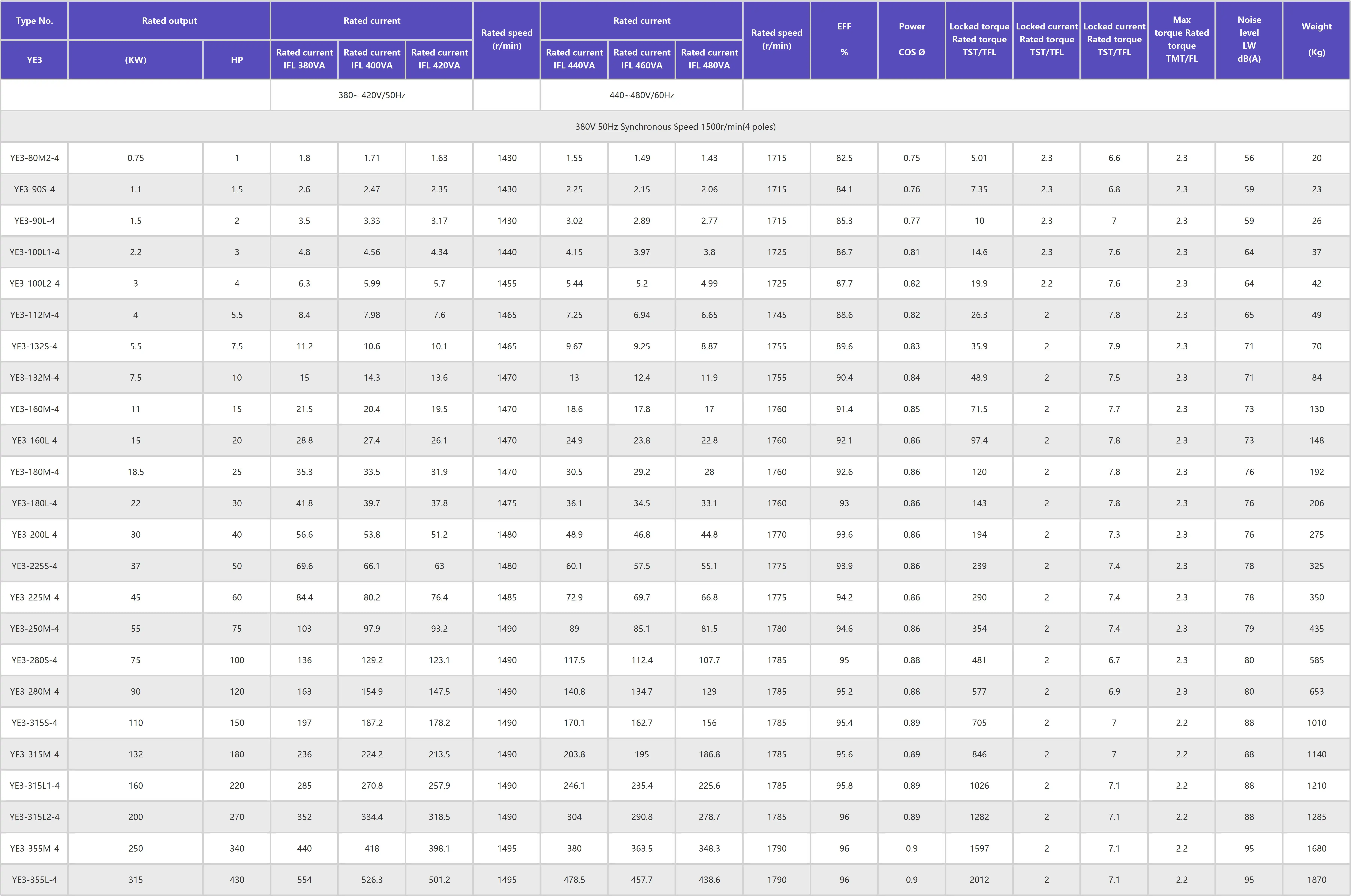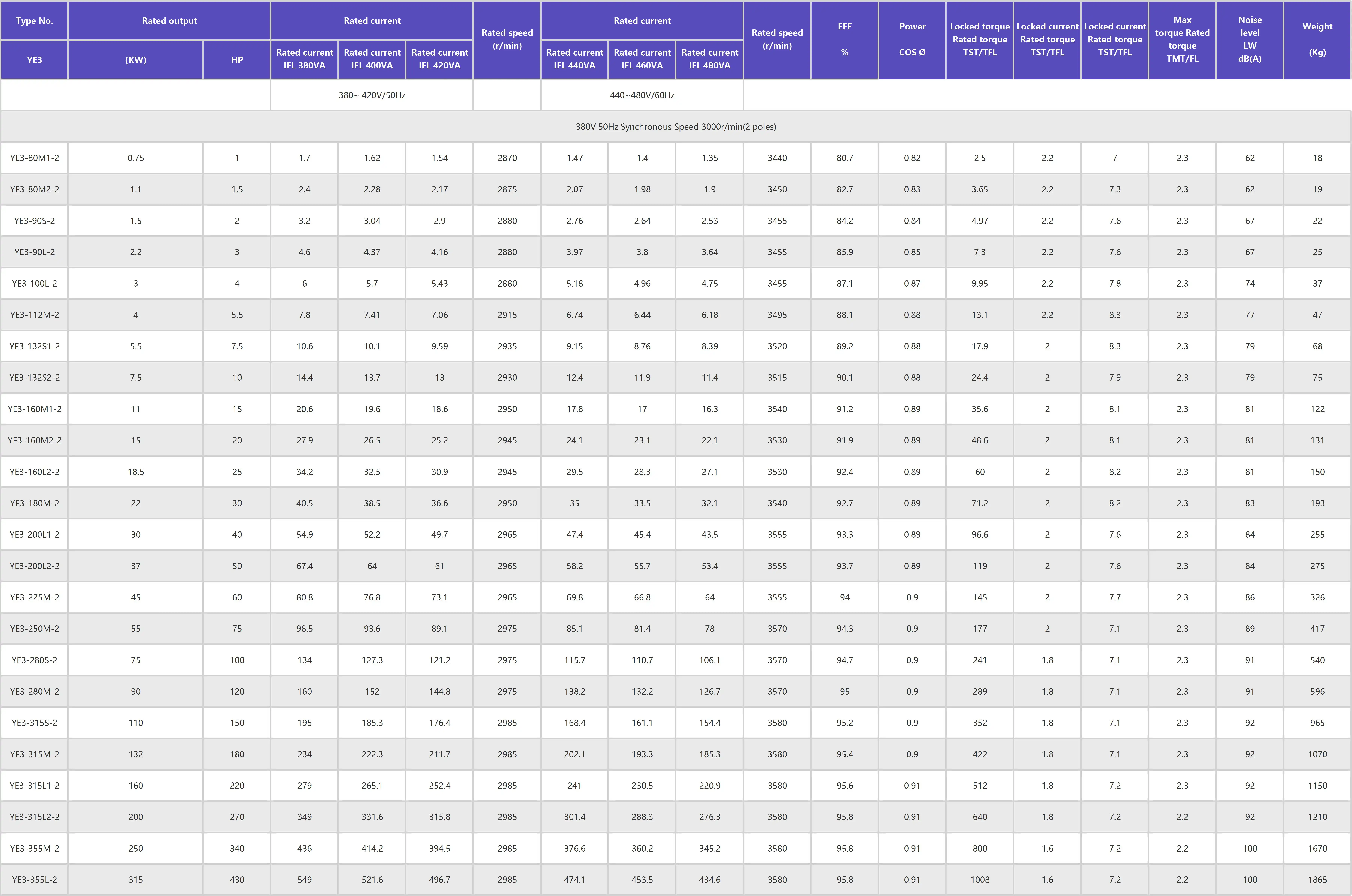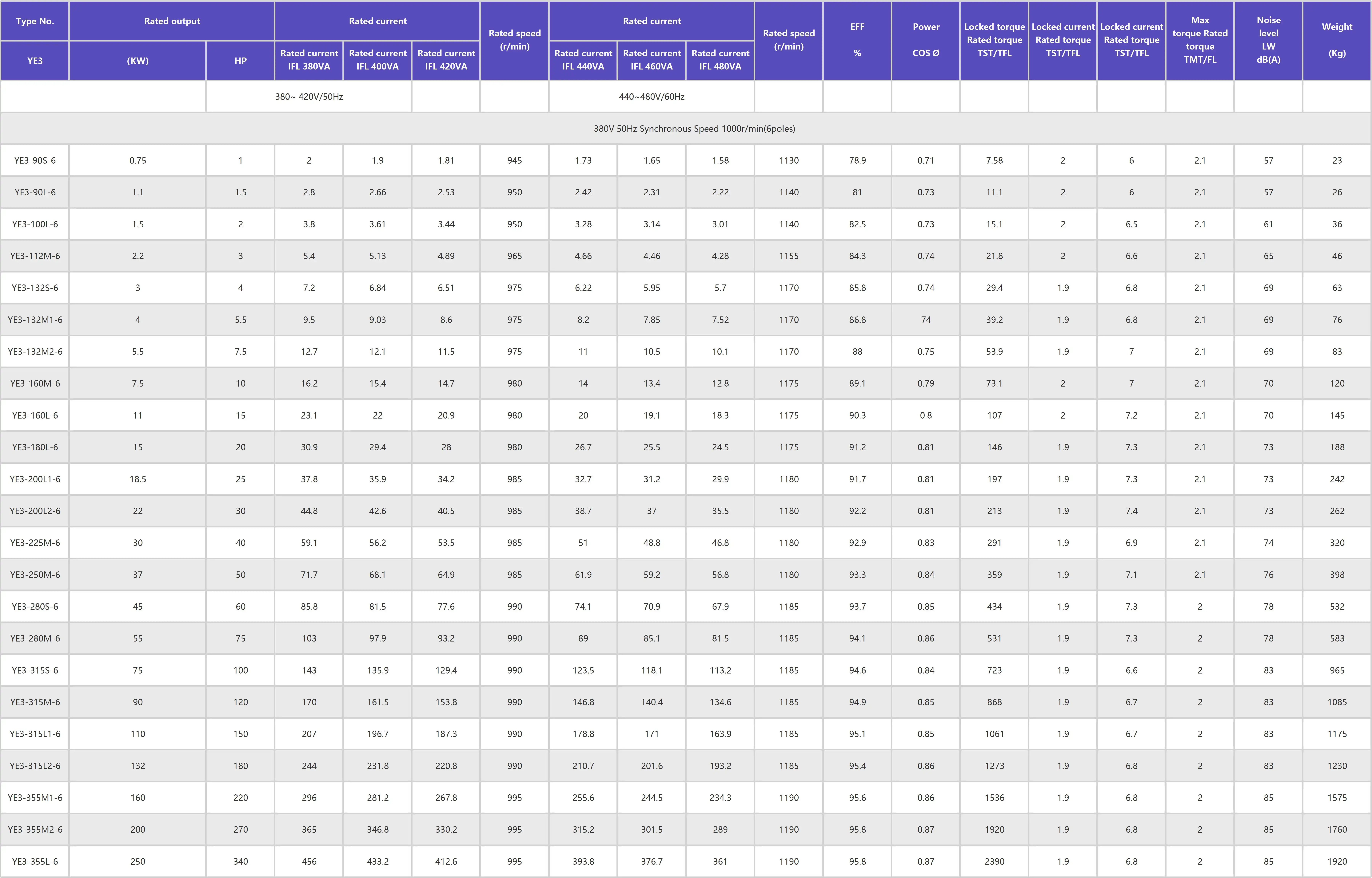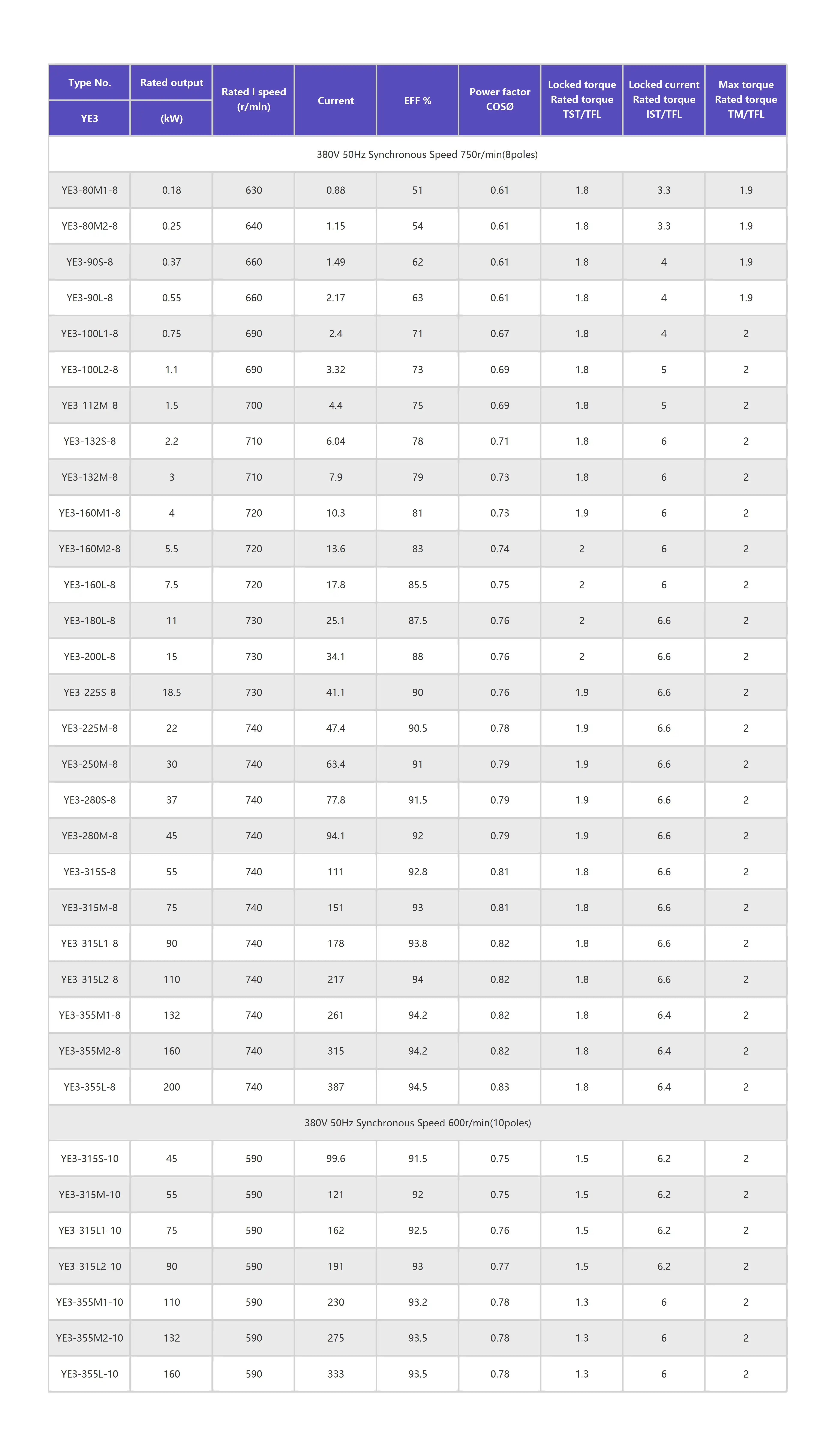 YE3 series high- efficiency three- -phase asynchronous motors are based on the latest development of fully enclosed self-fan air-cooled squirrel-cage ultra-high- efficiency three- -phase asynchronous motors based on GB/T28575- -2012. The 3-level energy efficiency level in the “Energy Efficiency Limit Values and Energy Efficiency Levels of Asynchronous Motors” is in line with IE3 in the energy efficiency level in IEC60034 -30, and it is in the first- class level with the most advanced American NEMA ultra- efficient motor.