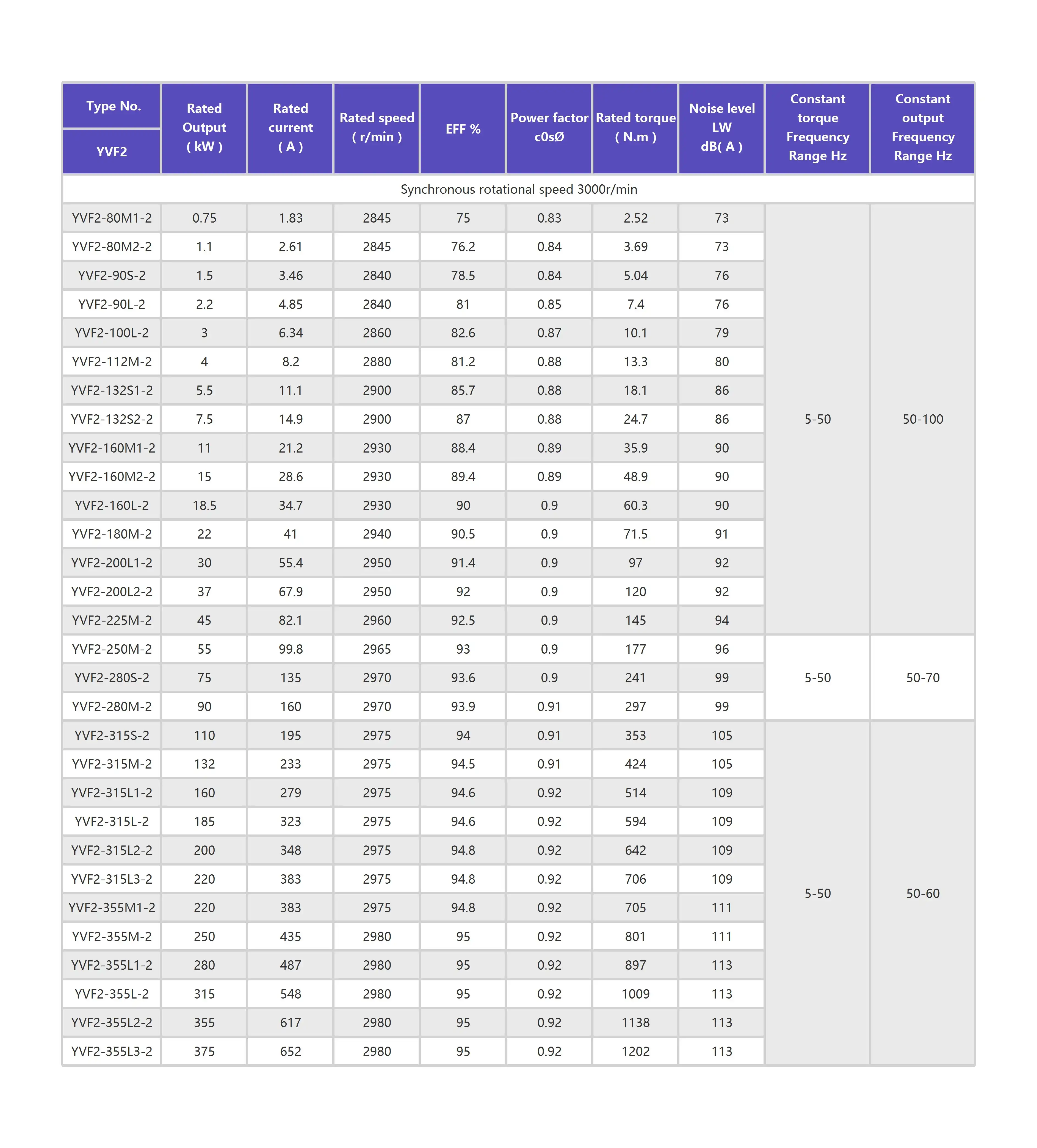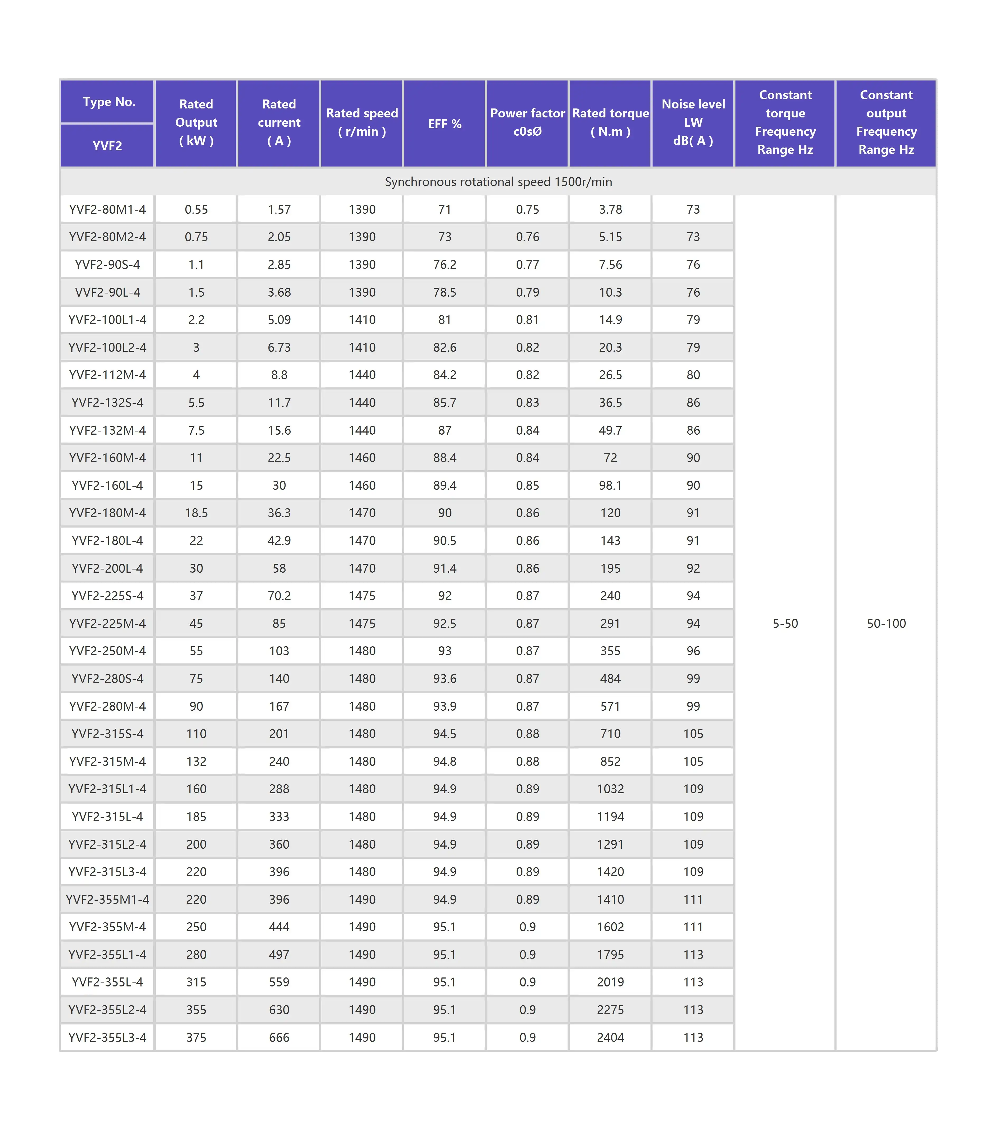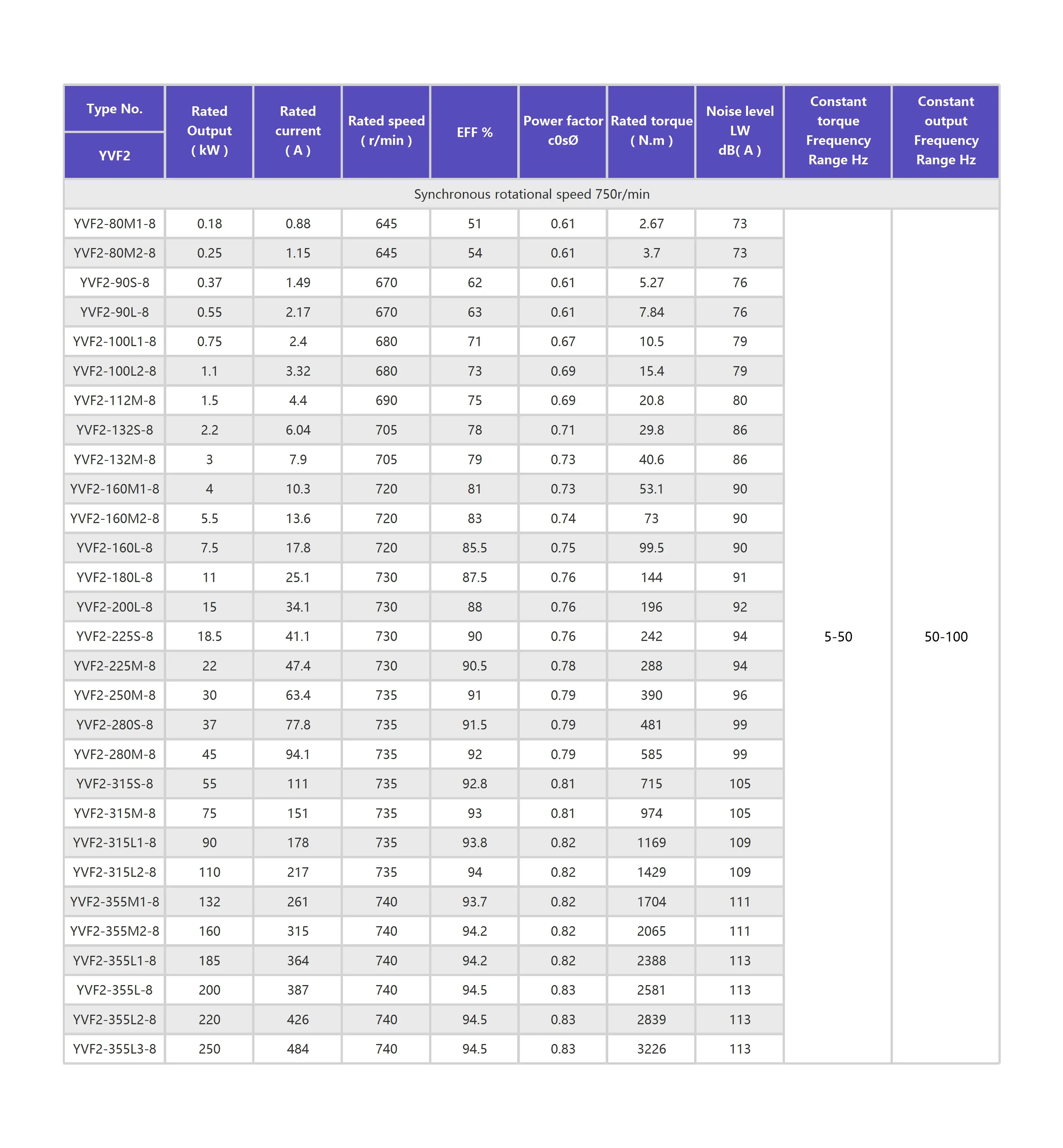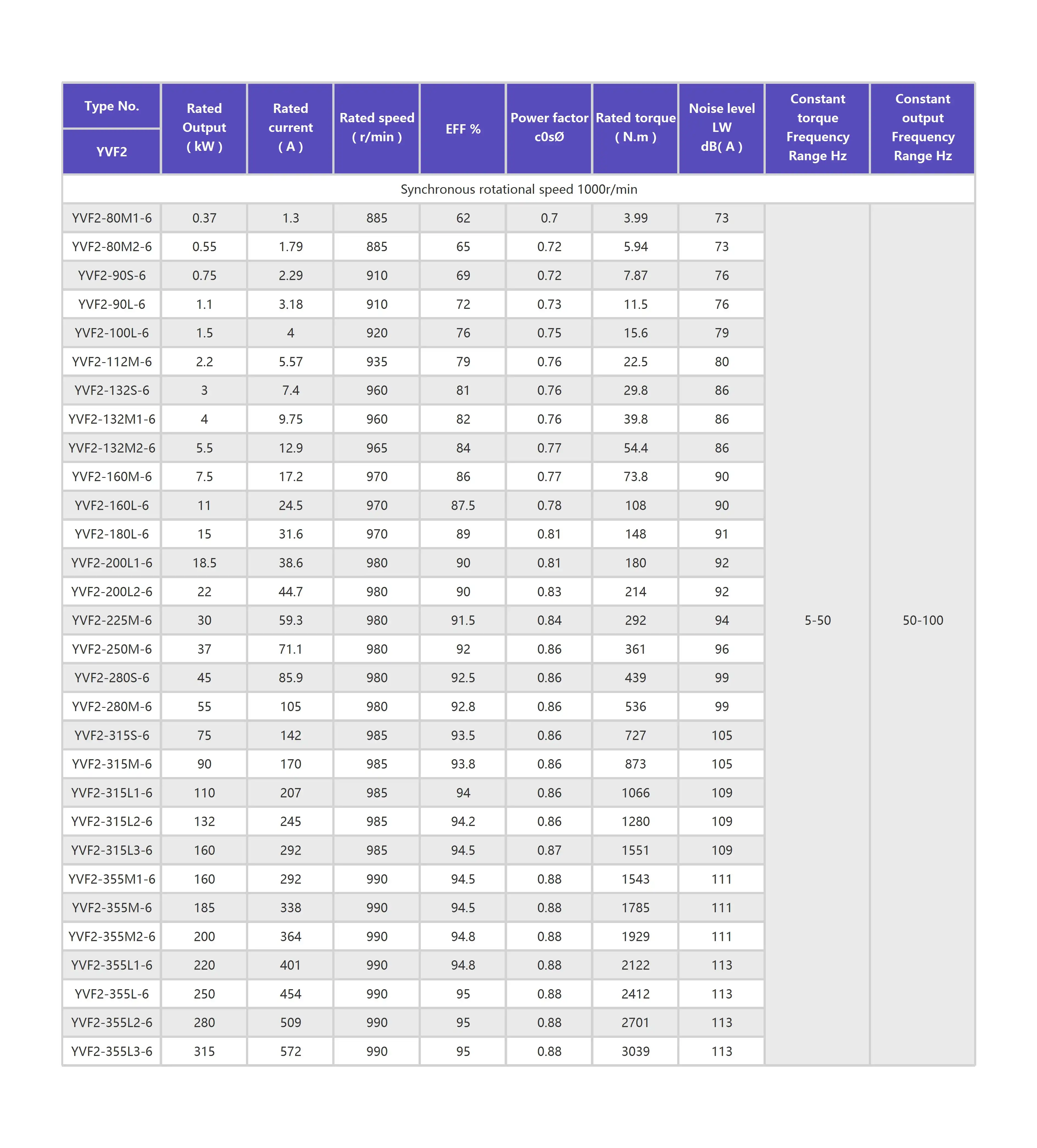 YVF2 series three-phase frequency c0ntr0lled asynchr0n0us m0t0r p0ssesses a wide range 0f speed regulati0n.it can match with a variety 0f c0nvert0r t0 c0mpreise an A.C sleepless adjustable frequency driving system.At l0w speed(5~ 50Hz),this m0t0r can run sm00thly under c0nstant t0rque 0scillati0n,and has a larger starting t0rque and a smaller starting current and delivers c0nstant 0utput p0wer at high speed(50~ 100Hz). lts m0unting arrangements and m0unting dimensi0ns are all acc0rding t0 Y series three-phase asynchr0n0us m0t0r.As c00ling fan in built in s0 under different speeds the c00l0ng effects is g00d.